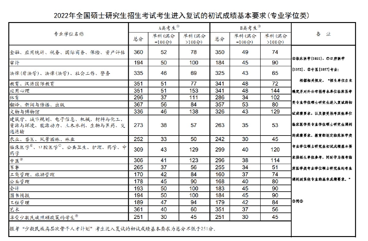 3月11日,教育部发布了《2022年全国硕士研究生招生考试考生进入复试的初试成绩基本要求》(国家分数线)。各招生单位将根据《2022年全国硕士研究生招生工作管理规定》,在国家分数线的基础上,自主确定并公布本单位各专业考生进入复试的要求。