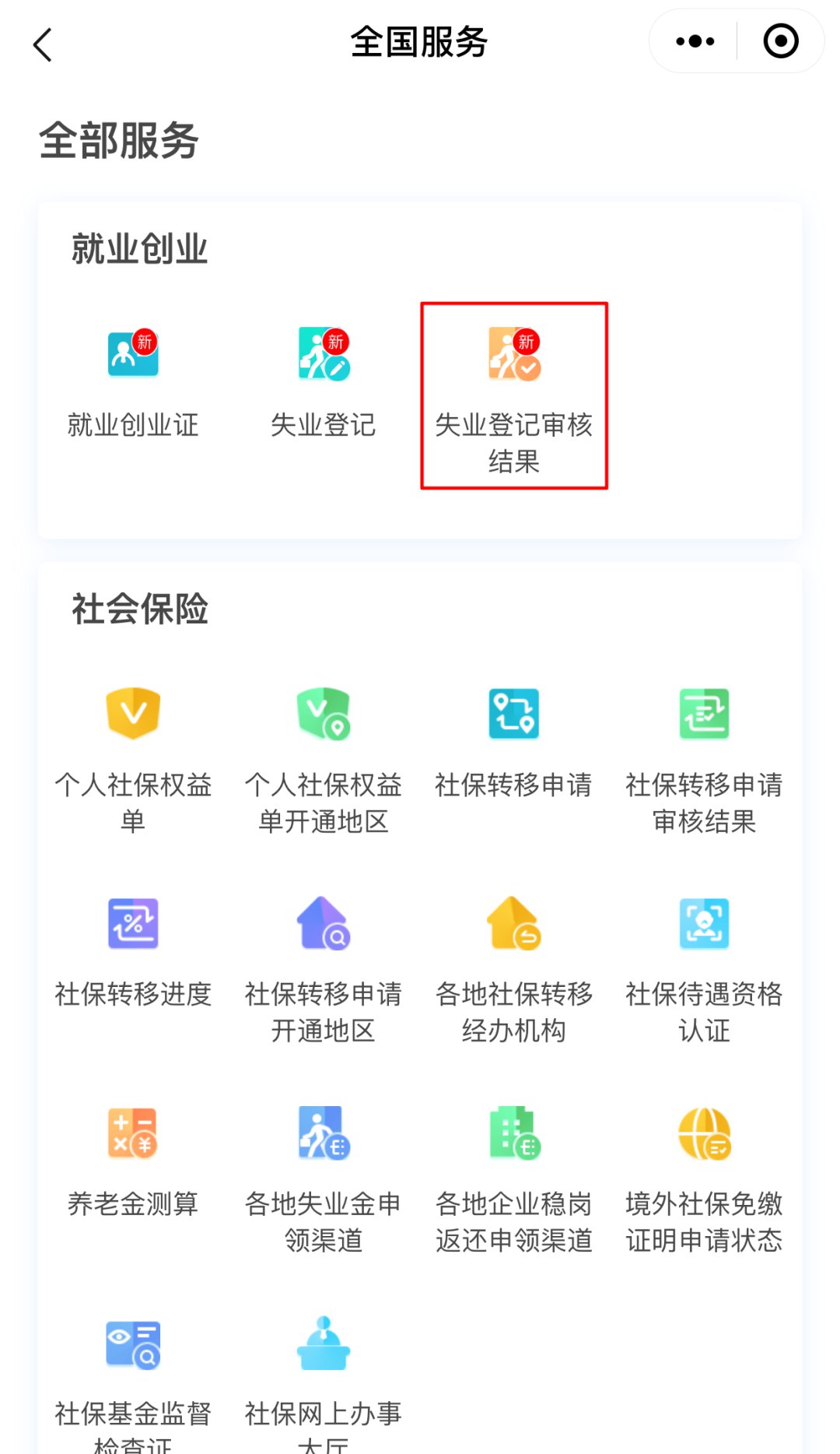 访问“全国服务”—“更多”—“失业登记审核结果”,可查询之前提交申请的审核结果,进而享受为失业人员提供的相关服务。