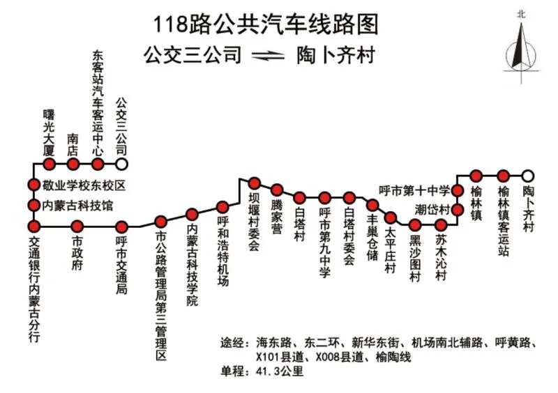118路公交车从公交三公司发车至陶卜齐村,途经海东街、东二环路、新华东街、机场南北辅路、呼黄路、101县道、008县道、榆陶线,单程41.3公里。设公交三公司、东客站汽车客运中心、市政府、呼市交通局、内蒙古科技学院、呼和浩特机场、坝堰村、白塔村、呼市第九中学、太平庄村、黑沙图村、呼市第十中学、榆林镇、榆林镇客运站、陶卜齐村等26个站点。