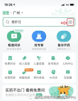 第二步:注册登录后,点击首页搜索框右侧的相机图标,,进入桥南街社区卫生服务中心;