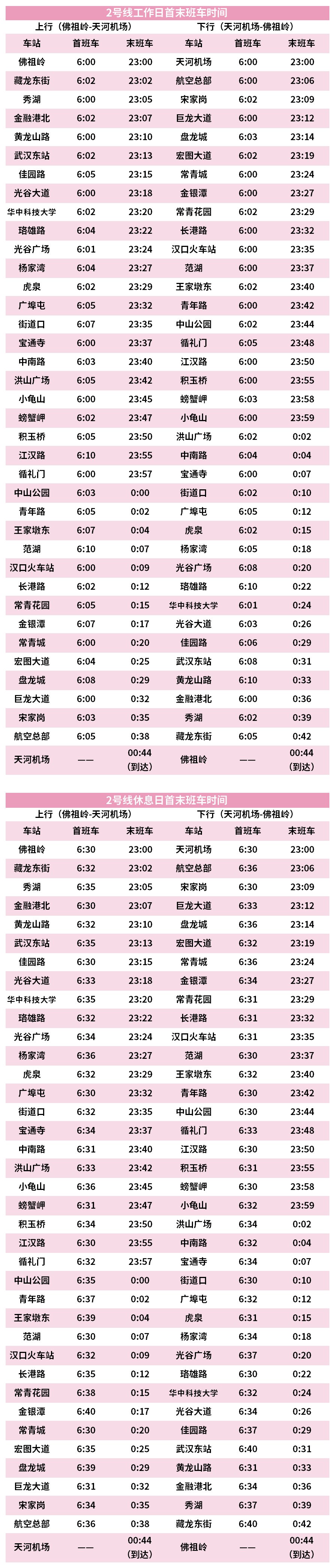 工作日期间,轨道交通1、2、3、4、5、6、7、8、11号线运营时间为6:00至23:00,轨道交通16号、阳逻线运营时间为6:00至22:30(国博中心南、金台方向末班车发车时间为22:30,周家河、后湖大道方向末班车发车时间为22:30)。