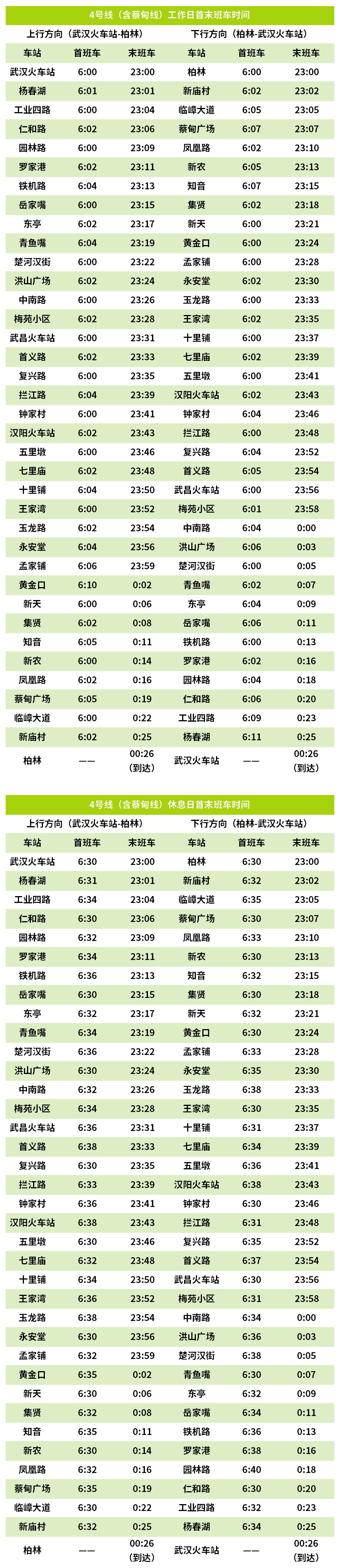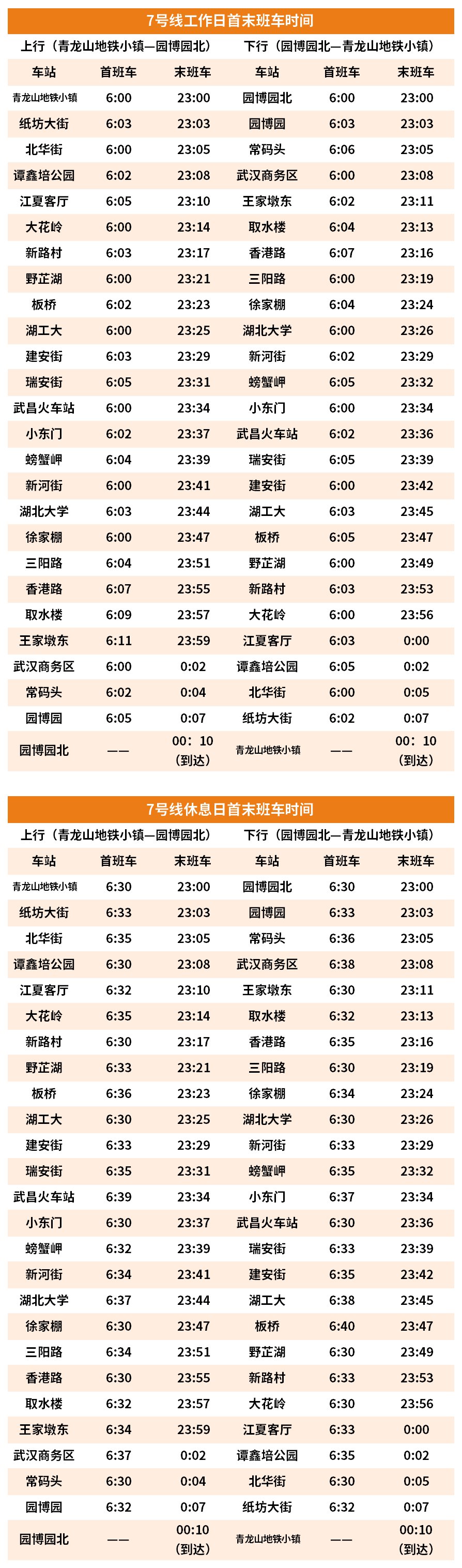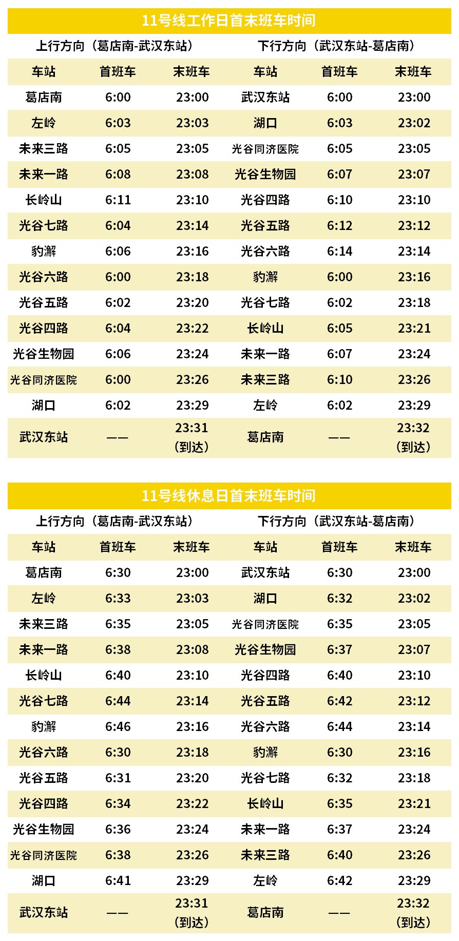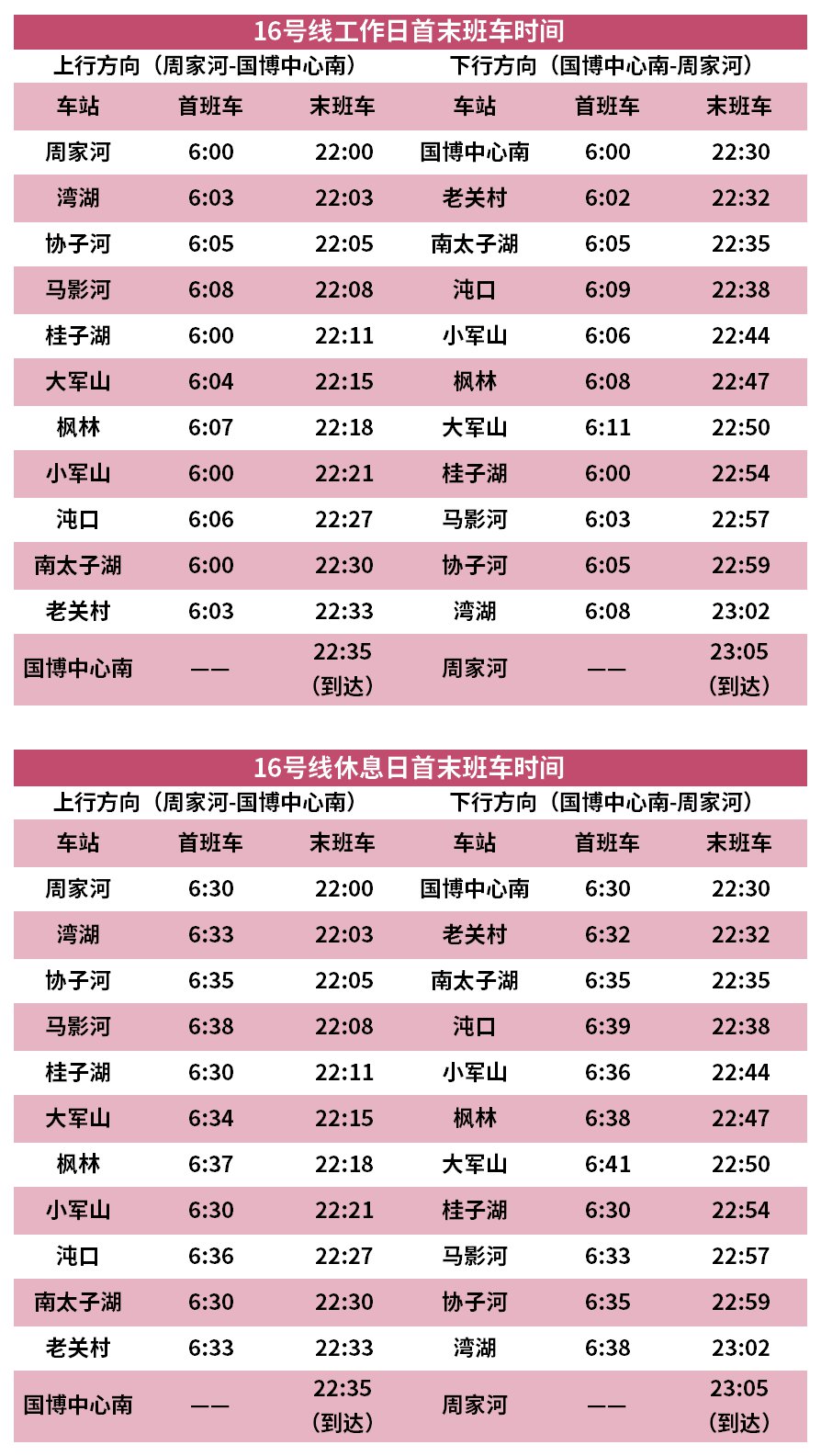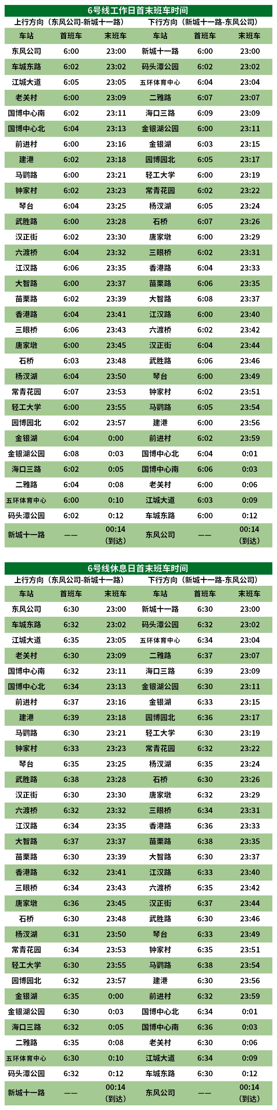 休息日期间,轨道交通1、2、3、4、5、6、7、8、11号线运营时间为6:30至23:00,轨道交通16号线、阳逻线运营时间为6:30至22:30(国博中心南、金台方向末班车发车时间为22:30,周家河、后湖大道方向末班车发车时间为22:00)。