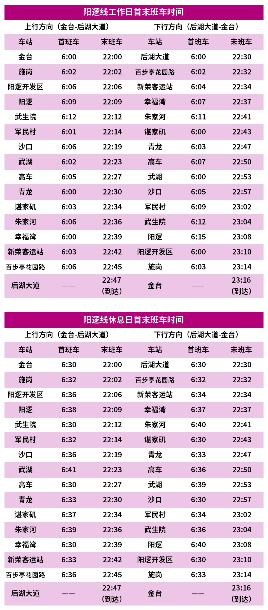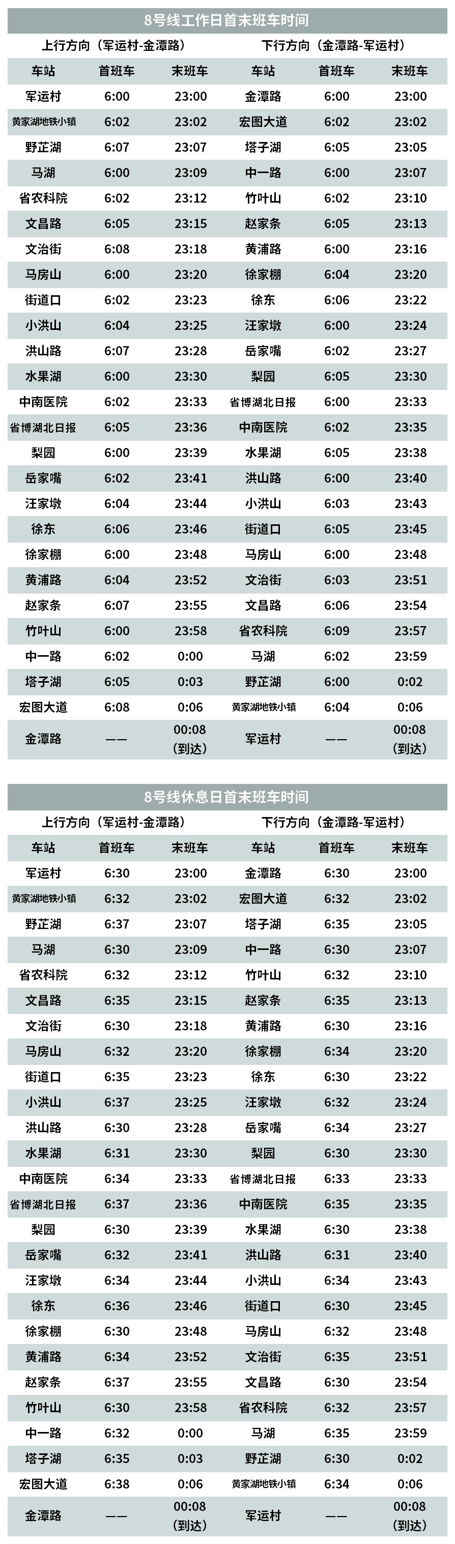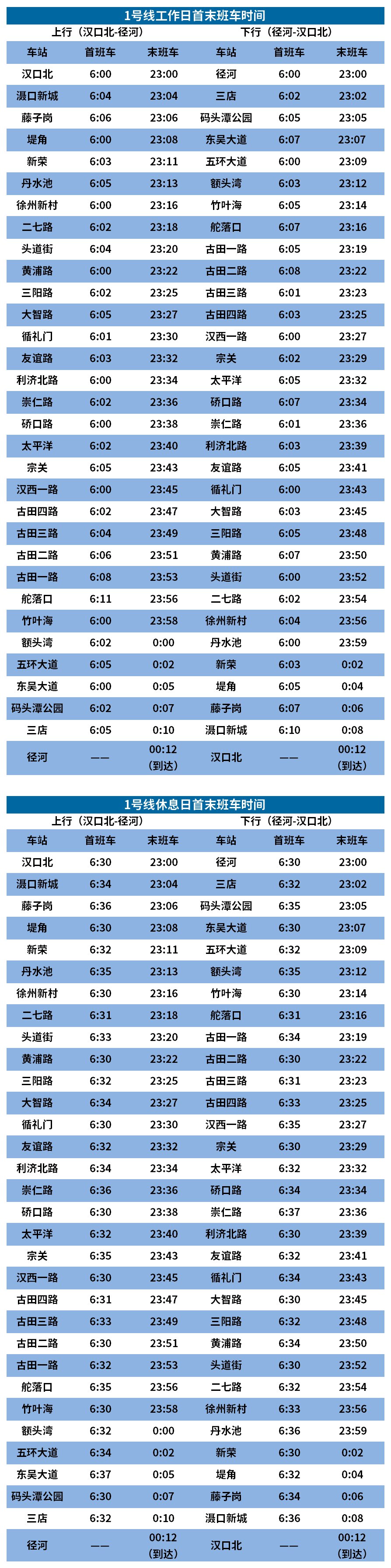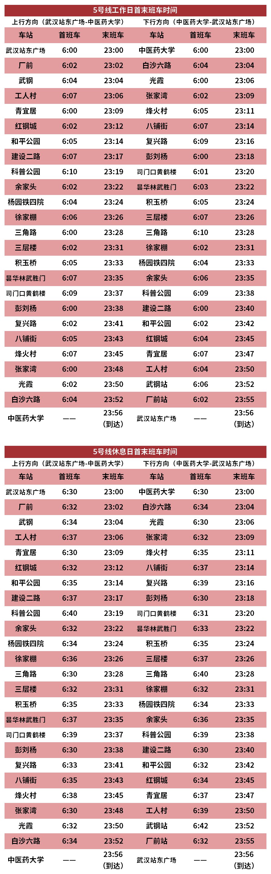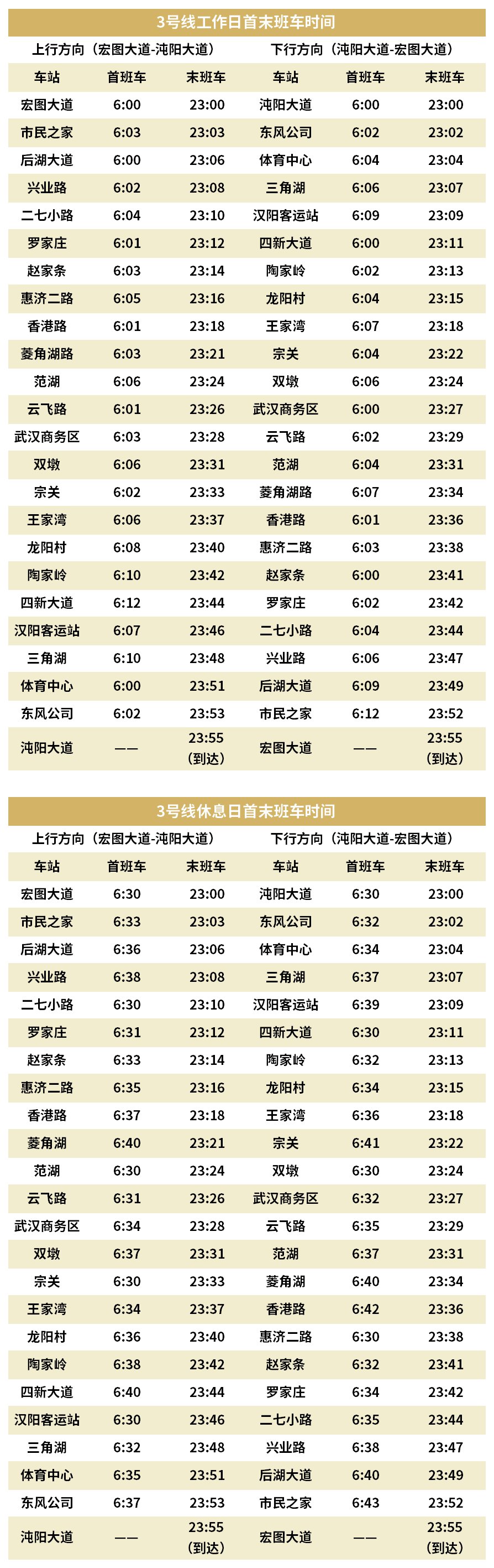 休息日期间,轨道交通1、2、3、4、5、6、7、8、11号线运营时间为6:30至23:00,轨道交通16号线、阳逻线运营时间为6:30至22:30(国博中心南、金台方向末班车发车时间为22:30,周家河、后湖大道方向末班车发车时间为22:00)。