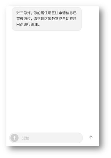 ③ 保存成功后,民警将在五个工作日对信息进行审核,审核状态进行短信提醒,审核通过短信内容:“XXX您好,您的居住证签注申请信息已审核通过,请到辖区警务室或自助签注网点进行签注”;审核不通过短信内容:“XXX您好,您的居住证签注申请信息审核未通过,原因:”。