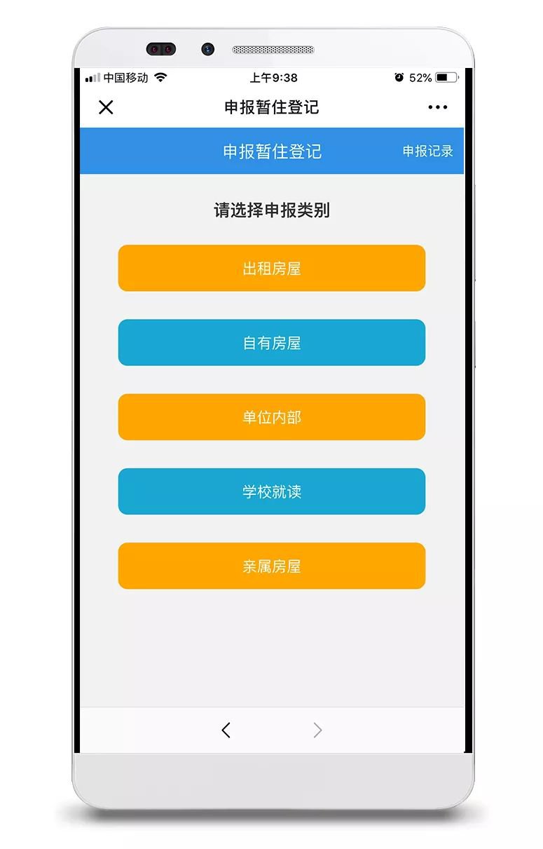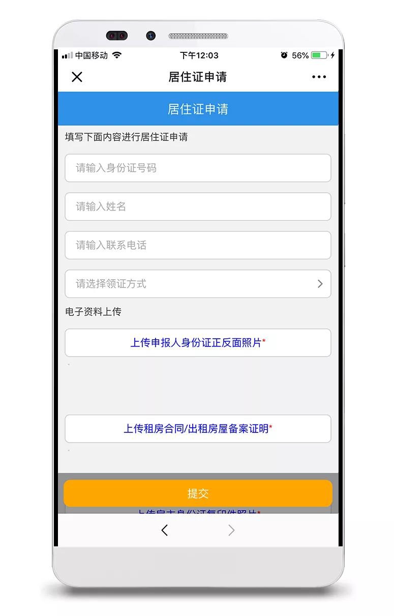 △“居住证签注申请”模块② 选择居住类别,填写个人信息,上传需要的电子材料,保存;