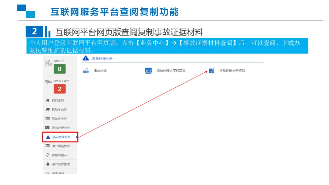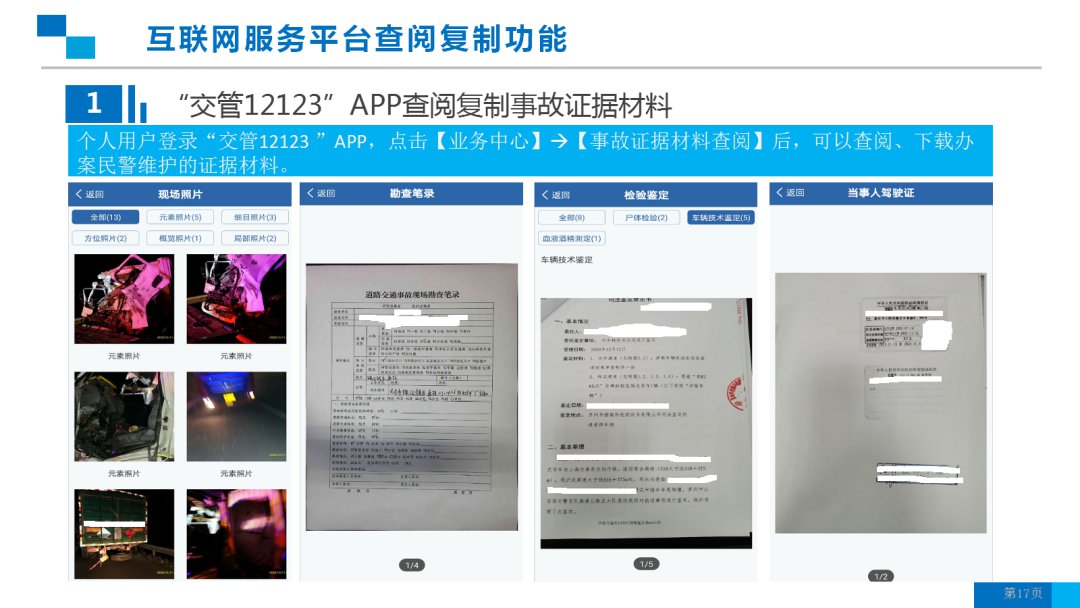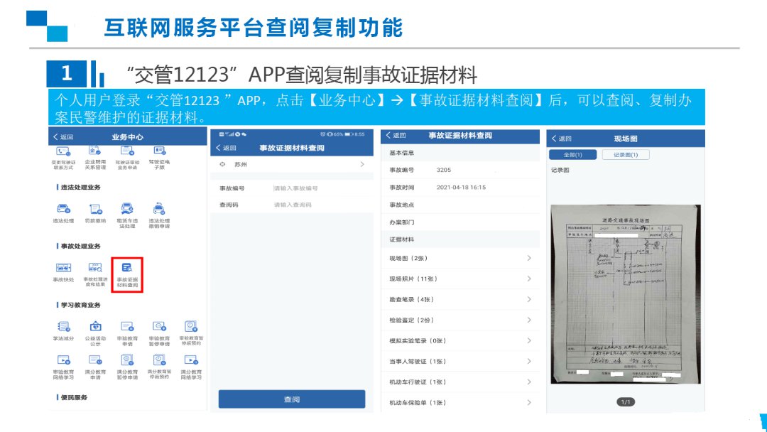 内蒙古自治区公安交管系统将全面推行互联网查阅复制交通事故证据材料服务。凡12月10日以后发生适用一般程序处理的道路交通事故,事故当事人及其代理人、死亡事故当事人近亲属及其代理人向事故处理民警提出申请,经公安交管部门审核,确认相关证据材料不涉及国家秘密、商业秘密或者个人隐私,以及应证人要求保密等情形,申请人收到查阅凭证后,登录“交管12123 ”APP,点击【业务中心】—【事故证据材料查阅】,即可查阅、下载事故现场图、现场照片等9类证据材料。