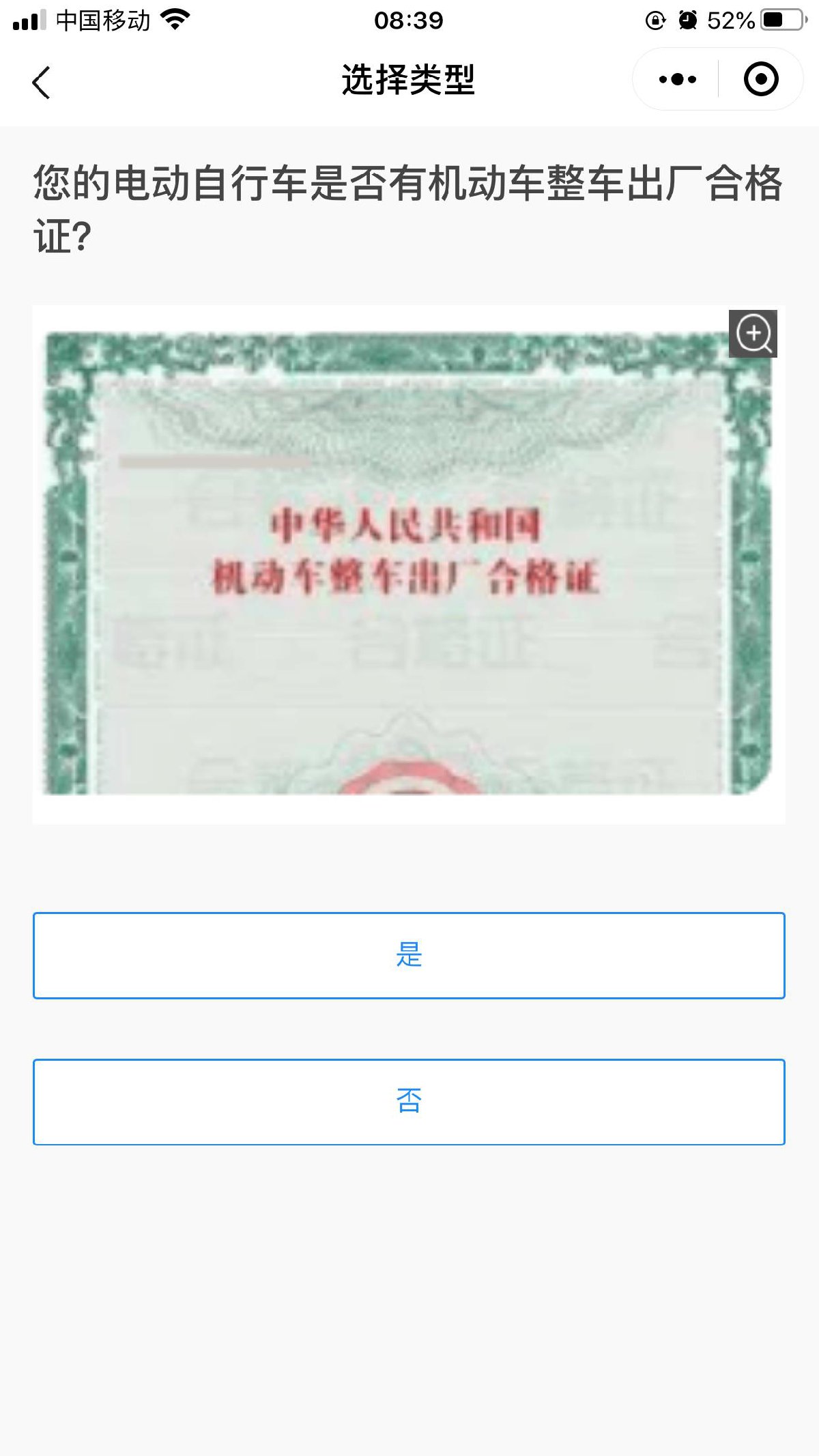 “是否有及机动车整车出厂合格证”等内容进行电动自行车类型确认。