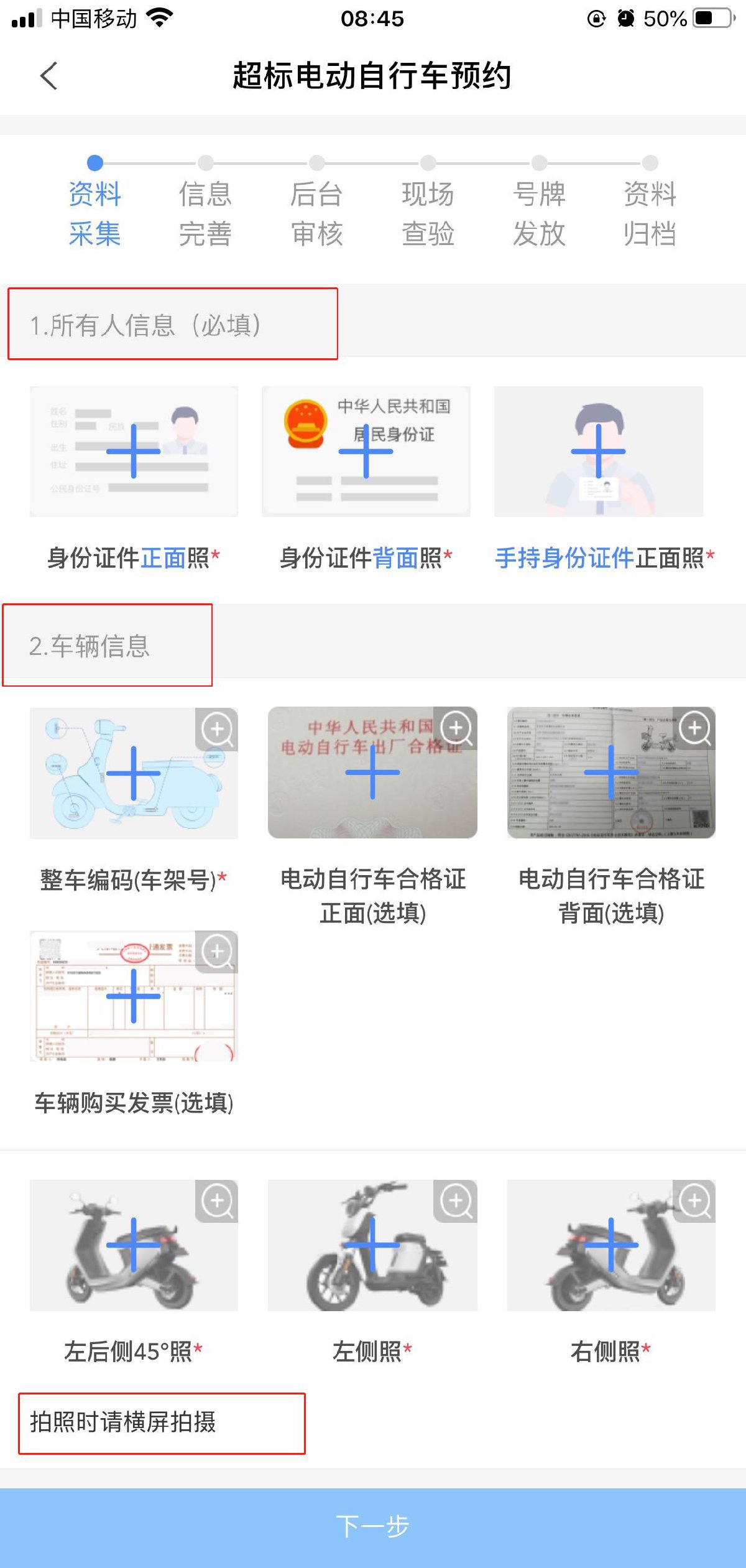 上传包括车架号、3C认证、车辆购置发票的照片;