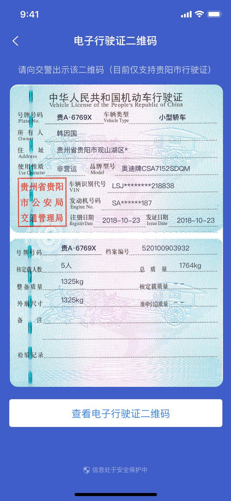 点击二维码下方的【查看车辆电子行驶证】,可查看车辆的完整行驶证信息。