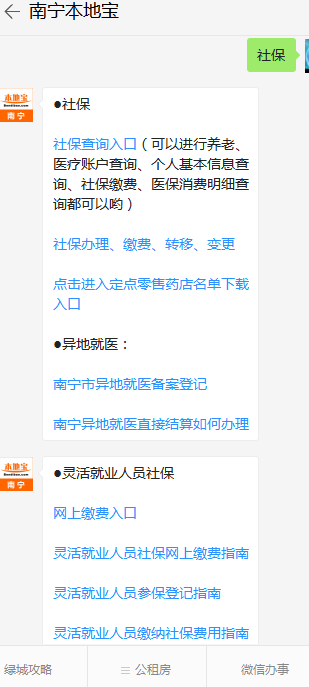 温馨提示:微信搜索关注南宁本地宝微信公众号(nannbdb),发送关键词“社保”获取南宁社保个人账户详情查询; 南宁社保卡网上申请方式及流程、制卡进度查询、社保卡领取地点查询; 南宁社保缴费凭证查询; 南宁市社保办理、缴费、转移、变更等信息