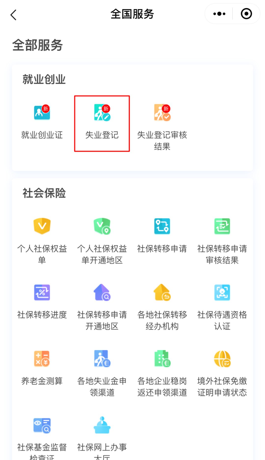 访问“全国服务”-“失业登记”,依提示完成相应操作。