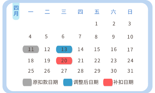 受疫情影响,为了使通过委托扣款的方式缴存住房公积金的单位有充分的时间办理缴存业务,2022年4月指定扣款日由11日(原10日为星期日顺延至11日)调整为13日(若13日扣款不成功的,20日再次进行扣款),请这部分单位在13日前可通过上海“一网通办”平台、上海住房公积金网、“上海公积金”APP等线上渠道完成人员变更,并确保约定扣款的银行账户内有足够余额完成汇缴。