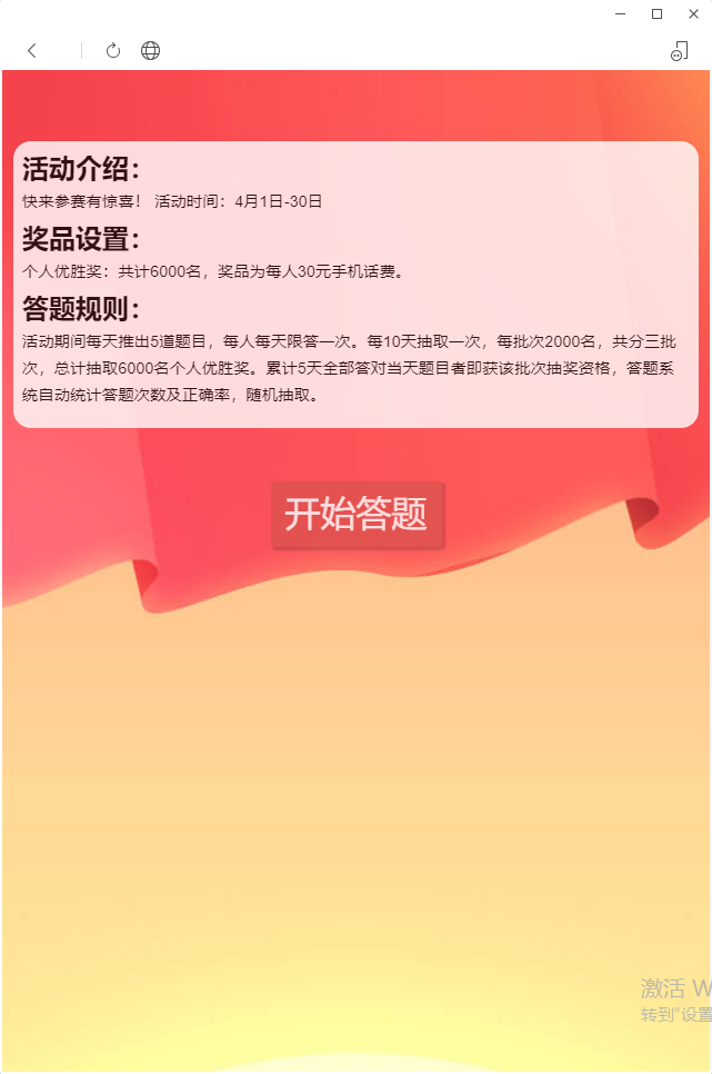 个人优胜奖:共计6000名,奖品为每人30元手机话费。