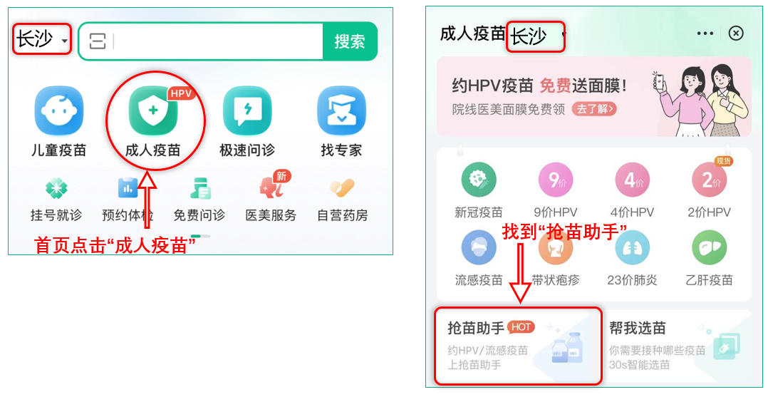 2、下载后,选择“长沙”地区,点击 “成人疫苗” ,点击“抢苗助手”。