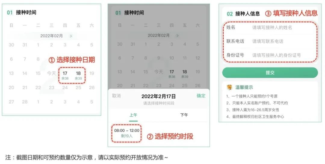 提示:请根据自身需求选择预约接种时间,并认真填写预约信息(很重要!)