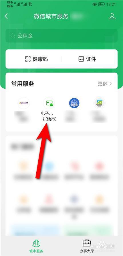 在城市服务页面,搜索并点击当地的社保电子卡。