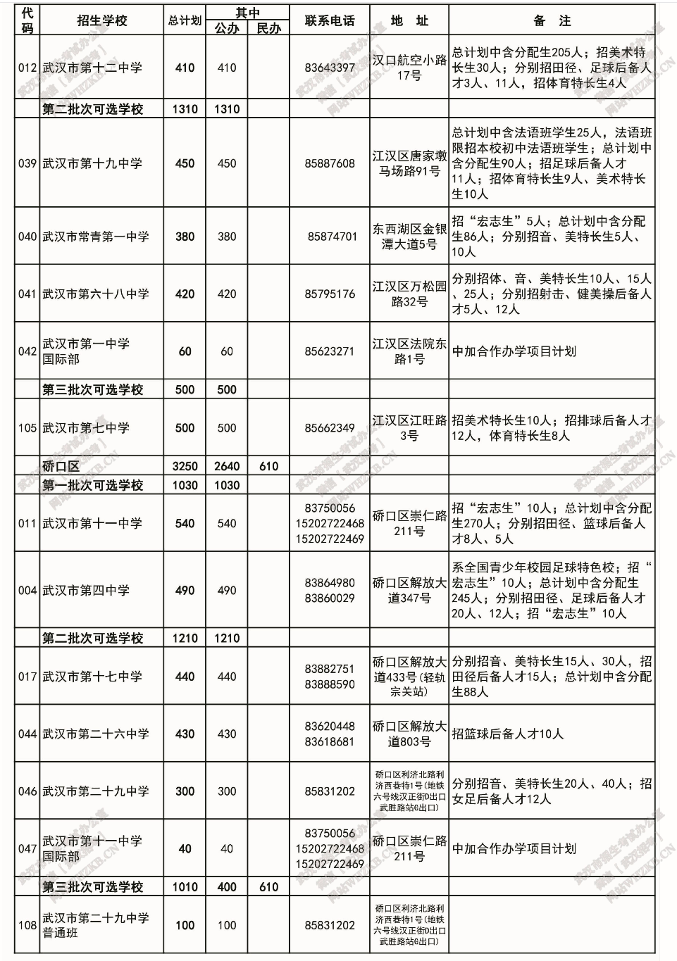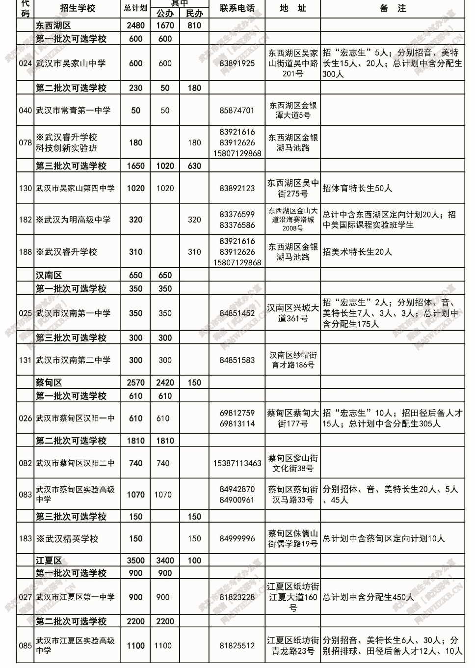 武汉市民族中学、华中师大一附中、武汉外国语学校,民办普通高中学校、各类中等职业学校面向全市招生。