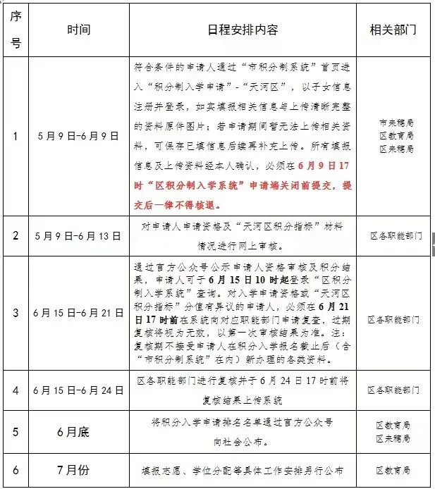 通过言方公众号公示申请人资格审核及积分结果。申请人可子6月15日10时起登录“区积分制入学系统”查询。对入学审请资格或“天河区积分指标”分值有异议的申请人,必须在6月21日17时前在系统向对应职能部门申请复查,过期复核将视为无效。以第一次审核结果为准。注:复核期不接受申请人在积分入学报名截止后(含“市积分制系统”在内)新办理的各类资料。