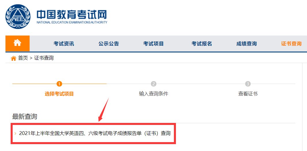 3、点击“2021年上半年全国大学英语四、六级考试电子成绩报告单(证书)查询”↓