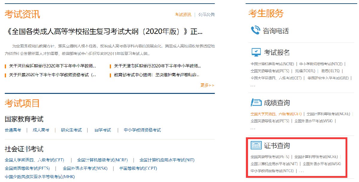 2、找到右侧【考生服务】-【证书查询】,点击【...】查看更多↓