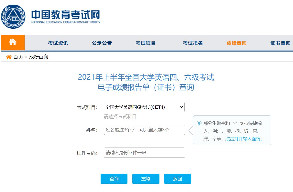 下载方式:考生可于2021年9月27日起,登录中国教育考试网,免费查询下载四六级电子成绩报告单(证书)。