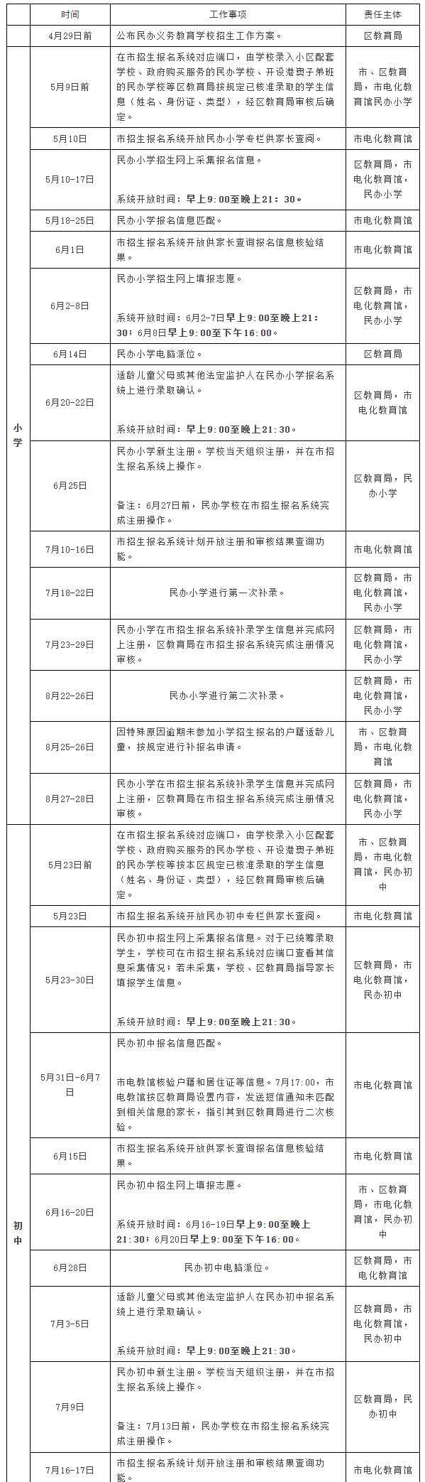 (一)统筹领导,明确责任。市教育局负责统筹指导全市民办学校招生工作,制定实施方案并督促落实。市电化教育馆根据工作需要,完善“广州市义务教育学校招生报名系统”及做好相关技术服务,邀请人大代表、政协委员、纪检人员、媒体记 者或家长代表等参与监督报名数据分发工作。区教育局负责协调相关部门,履行各自职责,组织实施民办学校招生工作,保障招生工作平稳有序。