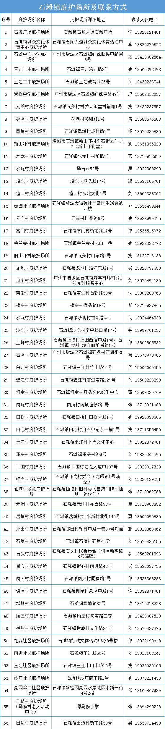 广东省水文局广州水文分局发布2022年首期洪水风险预警。据气象降雨预测, 10—13日广州市将有持续性暴雨到大暴雨局地特大暴雨降雨过程;上游西江、北江流域也将有一次大到暴雨为主,局部有大暴雨的强降雨过程。对于本次强降水来袭,广州市增城区石滩镇党委、政府高度重视,迅速启动应急工作预案,开放56个庇护场所,具体地址及联系方式如下: