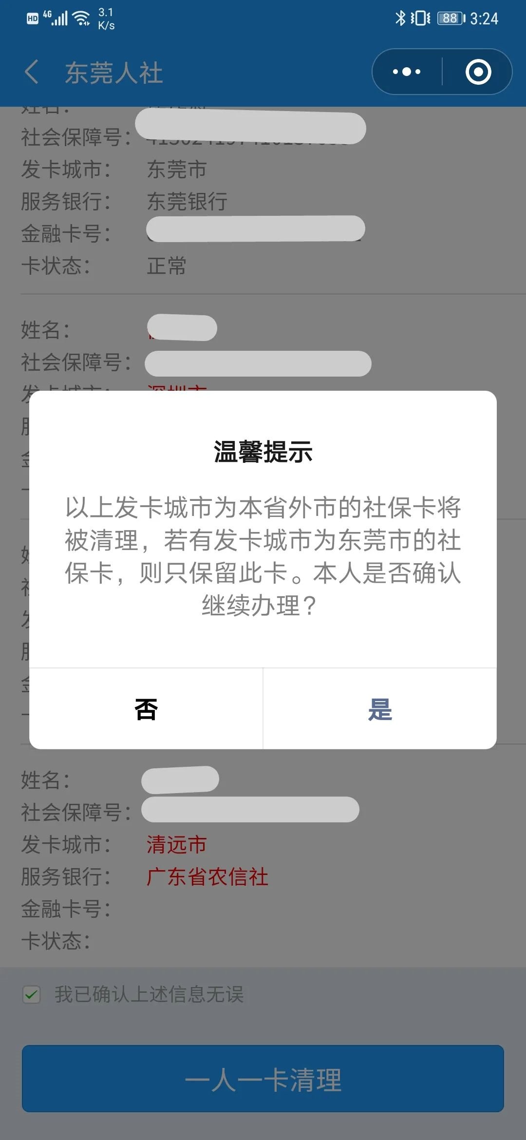 如符合,确认个人信息以及在广东省办理的所有社保卡信息,勾选“我已确认上述信息无误”->点击“一人一卡清理”