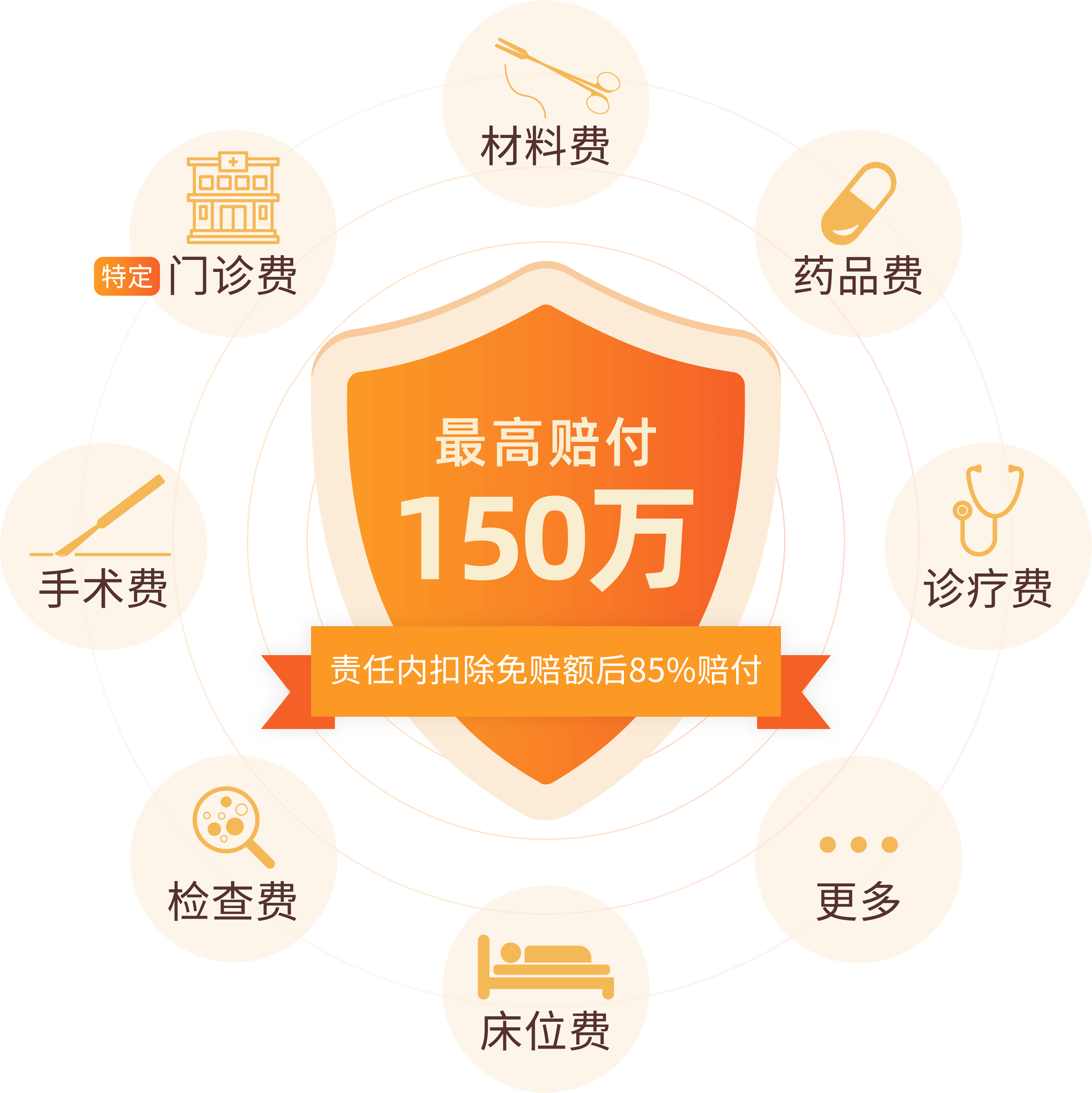 保障范围: 保险期间内,被保险人经医院诊断必须接受住院、特定门诊病种治疗所发生符合东莞市基本医疗保险范围内的并经由社会基本医疗保险、重大疾病医疗保险、补充医疗保险、医疗救助等政府办医保报销后自行负担的医疗费用。
