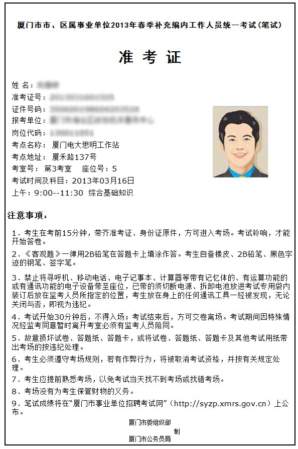7)招聘单位资格审核通过并且缴交报名费用的考生,应在规定时间内,通过"准考证打印"功能打印本人准考证,并在规定时间参加笔试考试。
