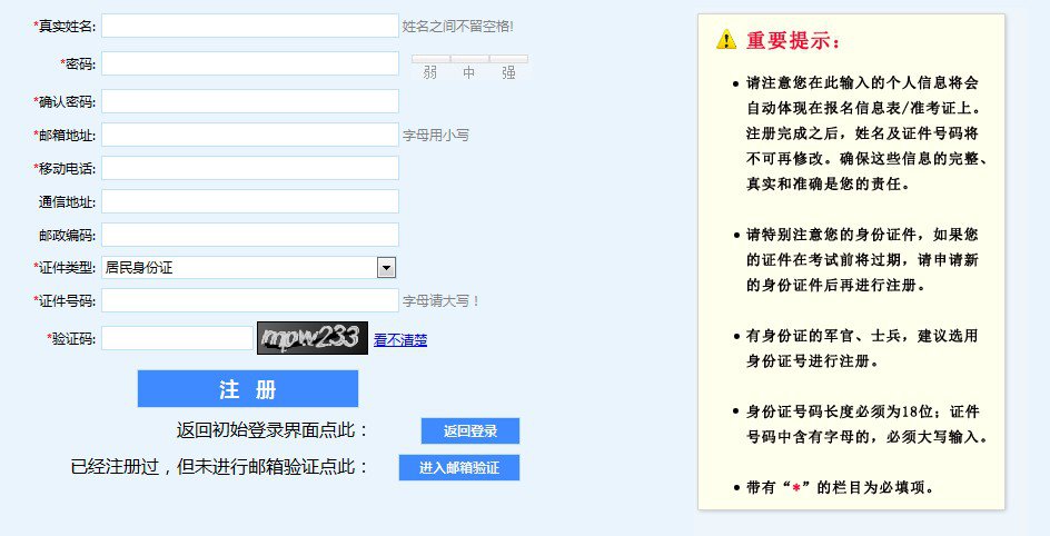 注意事项1:考生在报名时,应确保个人信息完整性和正确性。同时应牢记自己的帐号和密码,以便以后修改考生信息、岗位报名、缴交报名费用、查询分数等。