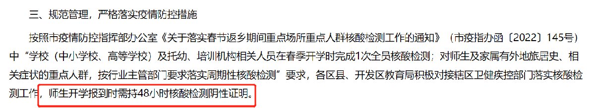 按照市疫情防控指挥部办公室《关于落实春节返乡期间重点场所重点人群核酸检测工作的通知》(市疫指办函〔2022〕145号)中“学校(中小学校、高等学校)及托幼、培训机构相关人员在春季开学时完成1次全员核酸检测;对师生及家属有外地旅居史、相关症状的重点人群,按行业主管部门要求落实周期性核酸检测”要求,各区县、开发区教育局积极对接辖区卫健疾控部门落实核酸检测工作,师生开学报到时需持48小时核酸检测阴性证明。