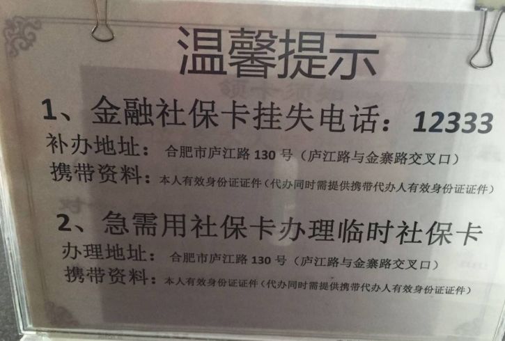 金融社保卡丢失、损坏无法使用或正在办理过程中,急需持卡就医、购药或办理其他业务的,可以携带有效身份证件在合肥市社会保障卡服务管理中心或各县(市)社会保障卡业务经办窗口申领临时卡(代办需携带代办人有效身份证件),提醒下大家临时卡有效期为3个月。