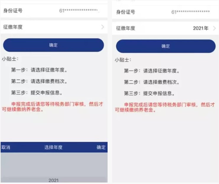 灵活就业人员一次性缴纳2021或2020年度全年基本养老保险费的,可下载“陕西养老保险”APP,实名注册登录,点击“业务办理”→“我要缴费”→“缴费申报”,选择“缴费年度”和“缴费档次”,信息核对无误后,点击“确认申报”。