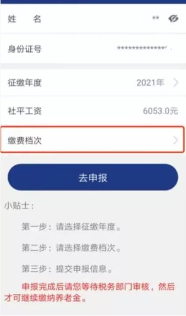 (3)点击“缴费档次”选项,选择对应档次。点击“去申报”按钮。