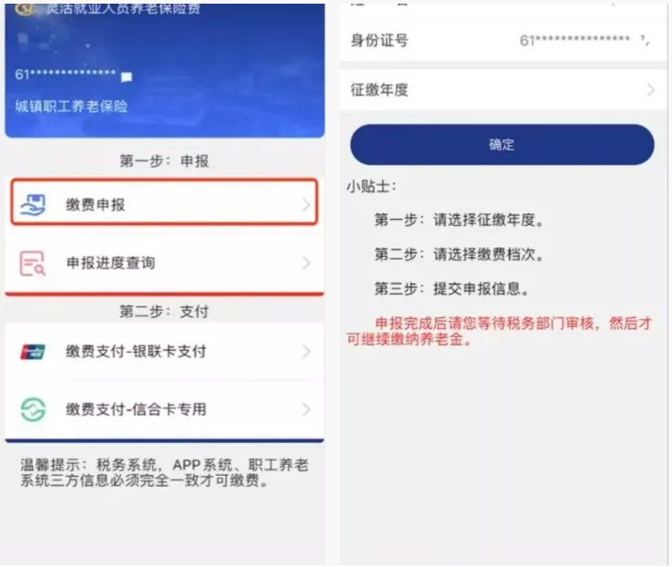 灵活就业人员缴纳养老保险费,按照“经办机构核定、税务部门征收”流程,先申报缴费基数,再通过手机APP或银行柜面缴纳养老保险。