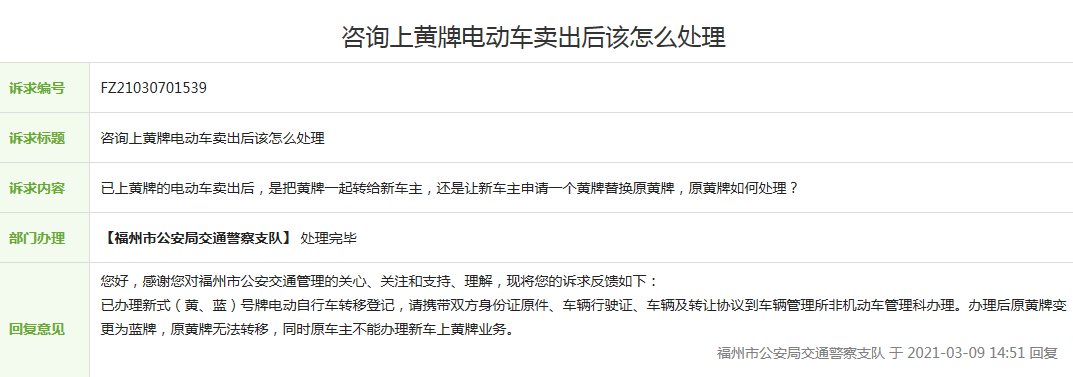 已办理新式(黄、蓝)号牌电动自行车转移登记,请携带双方身份证原件、车辆行驶证、车辆及转让协议到车辆管理所非机动车管理科办理。
