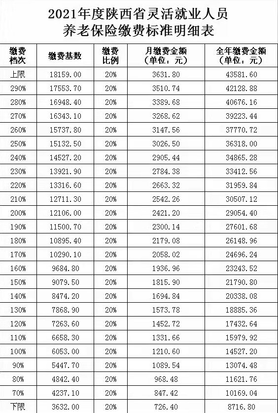 2021年度职工基本养老保险个人缴费基数上限为18159元,下限标准3632元,共25个缴费档次。缴费档次一经选定,年度内无法变更。因疫情等原因缓缴2020年度养老保险费的,可在我省2021年度月缴费上、下限标准之间自主选择缴费基数,自愿申报缴纳2020年度养老保险费。