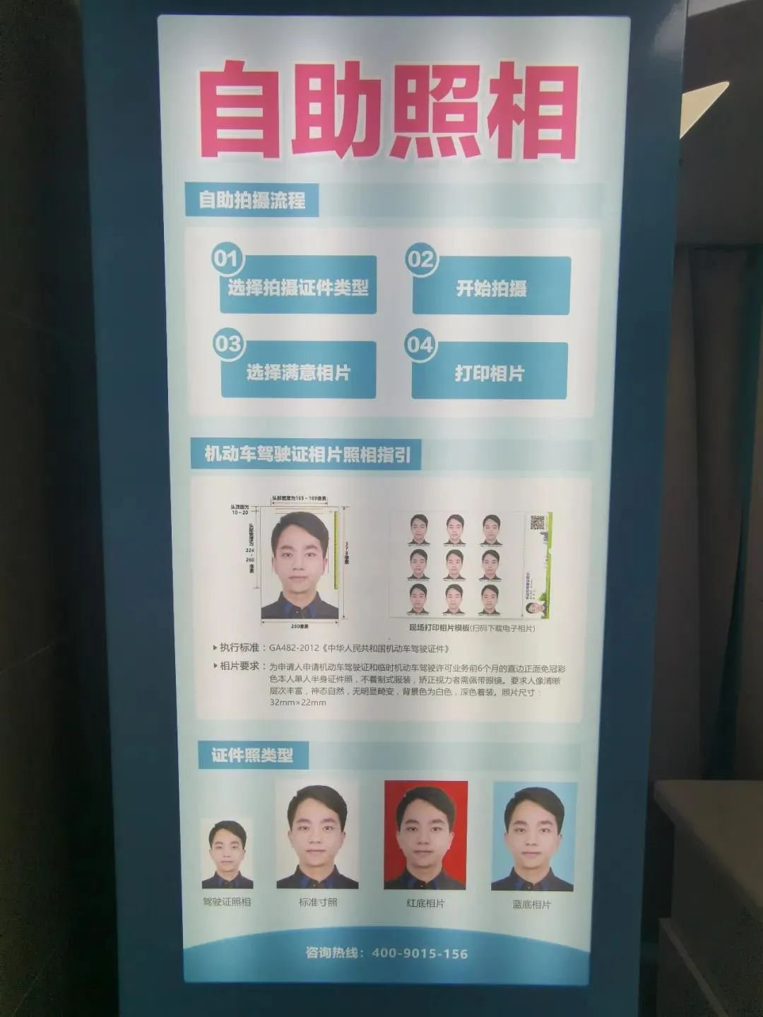 (3)在查询本人无未处理的交通违法后到自助拍照机上进行拍照;(拍照流程:选择拍摄证件类型→开始拍摄→选择满意相片→上传照片)