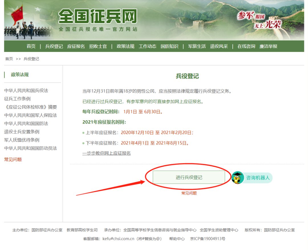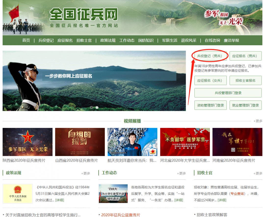 登录“全国征兵网”(网址:http://www.gfbzb.gov.cn),点击右侧“兵役登记(男兵)”