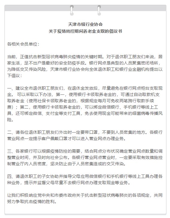 天津市银行业协会发出《关于疫情防控期间养老金支取的倡议书》,向全体退休职工和银行业金融机构提出倡议,倡议主要内容包括:
