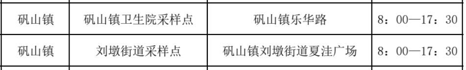 为方便群众就近进行核酸检测,2022年4月15日,庐江县公布了29个核酸采样点,其中矾山镇具体名单如下: