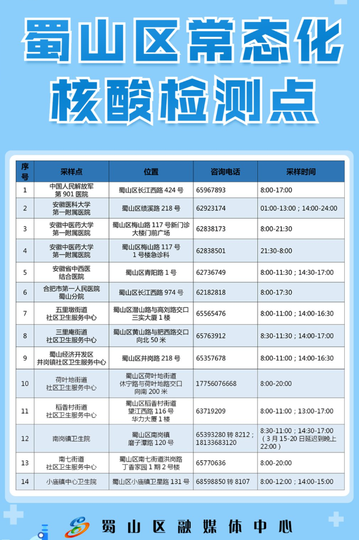 2022年3月15日,蜀山发布官微发布了关于常态化核酸检测点的消息,其中蜀山区三里庵街道社区卫生服务中心包括在其中。