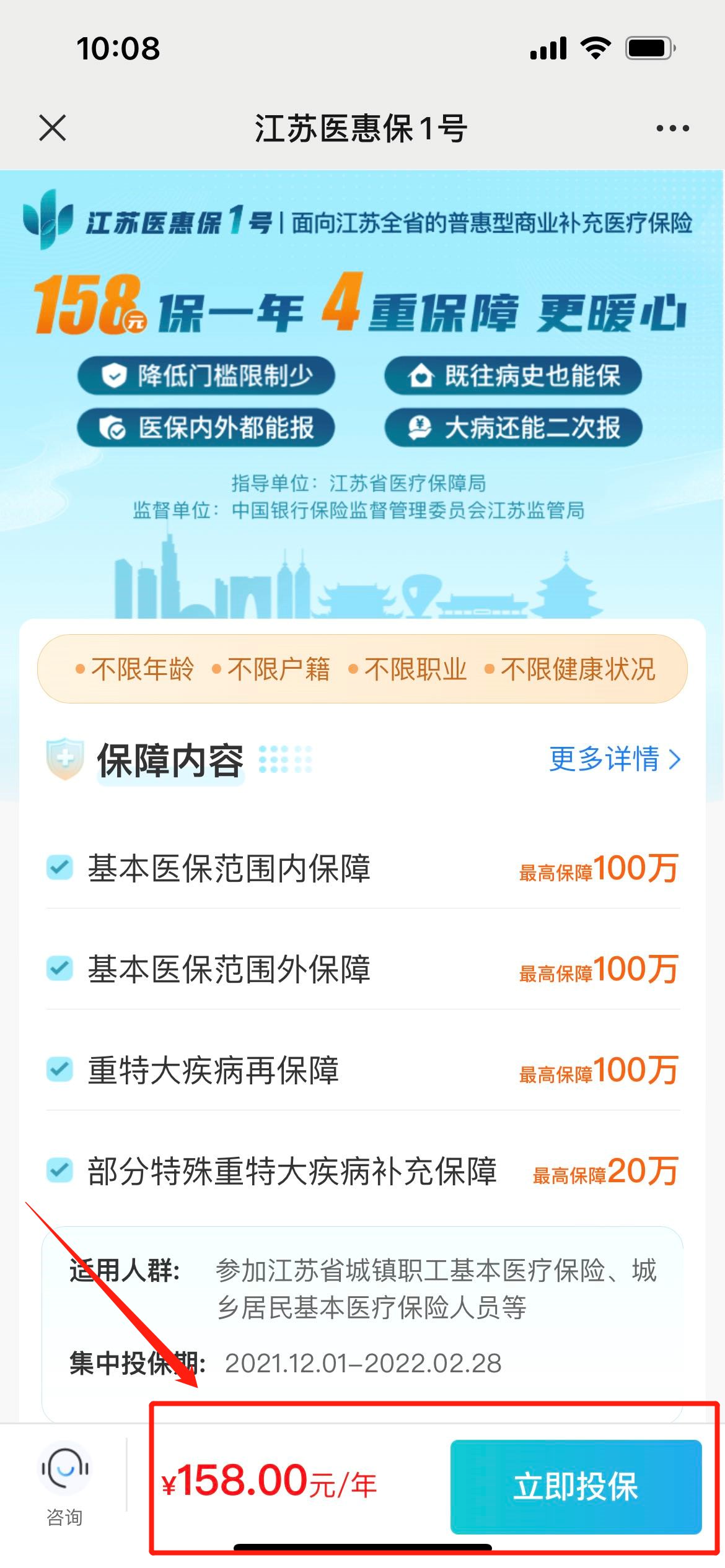 除此之外,还可通过支付宝、“江苏医保云”APP、各设区市医保公共服务平台以及共保体11家保险公司APP或线下销售渠道投保,或向共保体11家保险公司和业务员咨询购买。