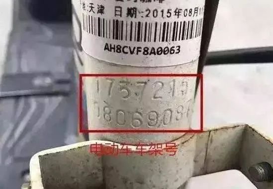4、电动自行车的车架号照片(影像应清晰,15位车架号字符完整,车架号周边无遮挡或包围物);(建议拍摄后,将图片放大,在保证清晰的情况下,裁剪号码那一块,尽量保持车架号部分在照片正中),实在不会拍可以让车行老板帮忙,他们拍的比较多,有经验一点哦!