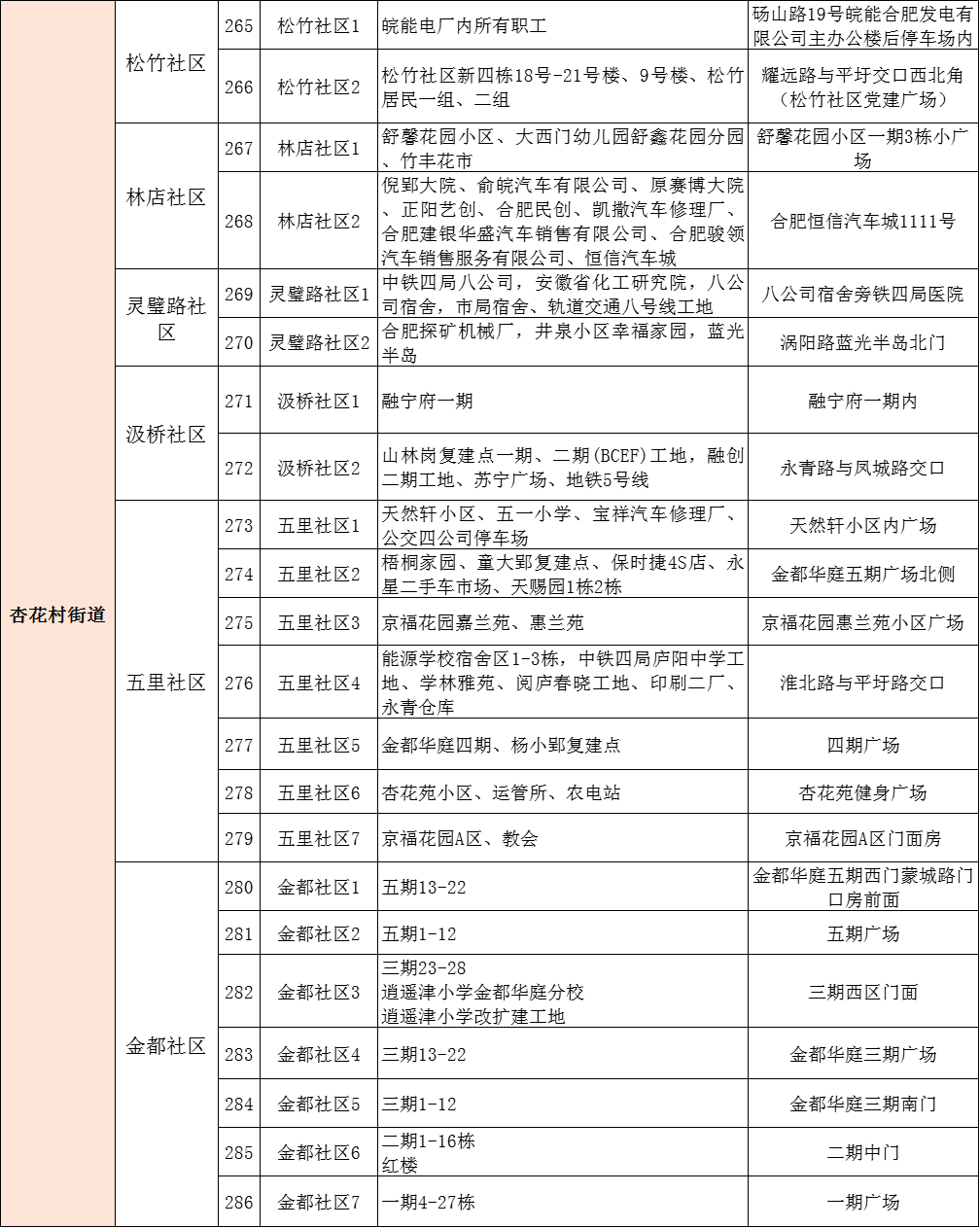 合肥庐阳区杏花村街道全员核酸点分布表