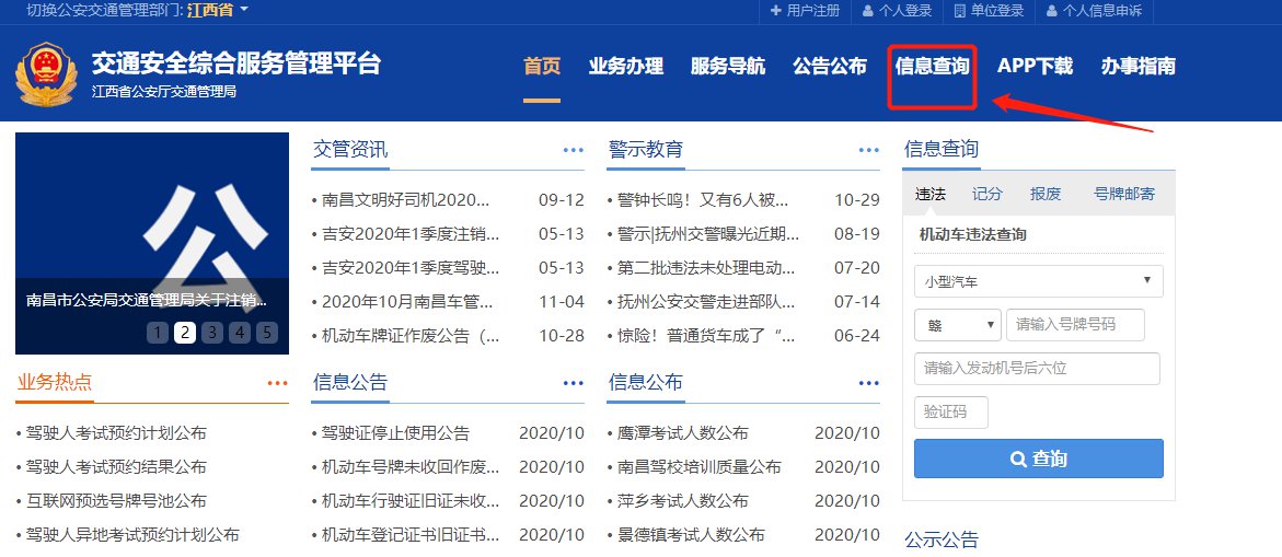 第一步:进入江西省交通安全综合服务平台(https://jx.122.gov.cn/),点击首页信息查询
