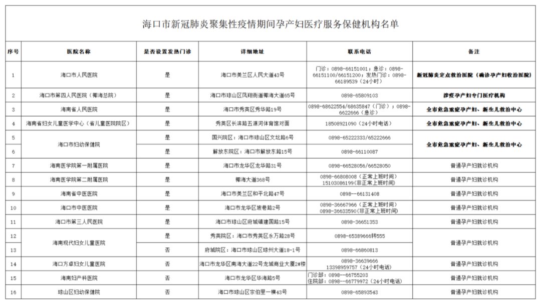 附件:海口市新冠肺炎聚集性疫情期间孕产妇医疗服务保健机构名单