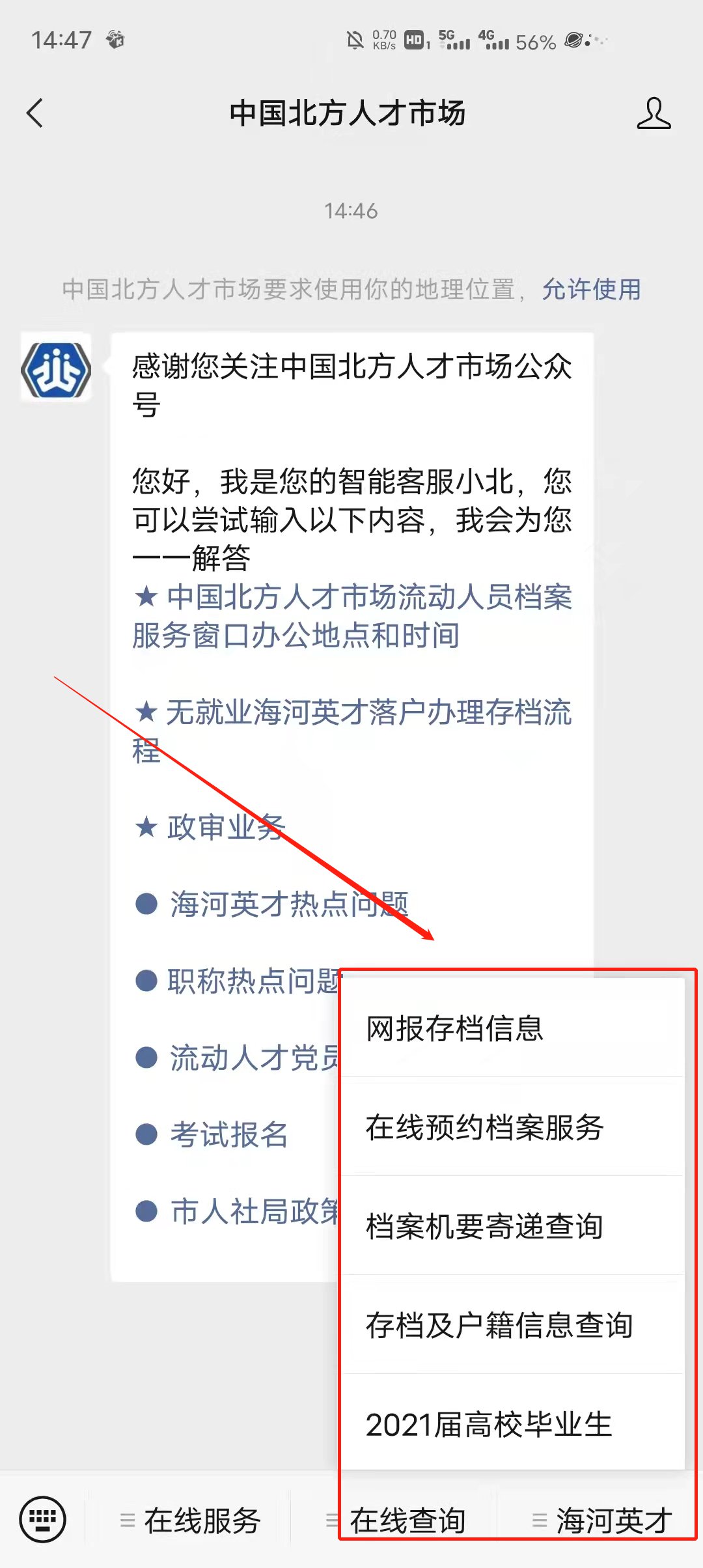 或关注“中国北方人才市场”微信公众号后,通过公众号留言及自助查询。
