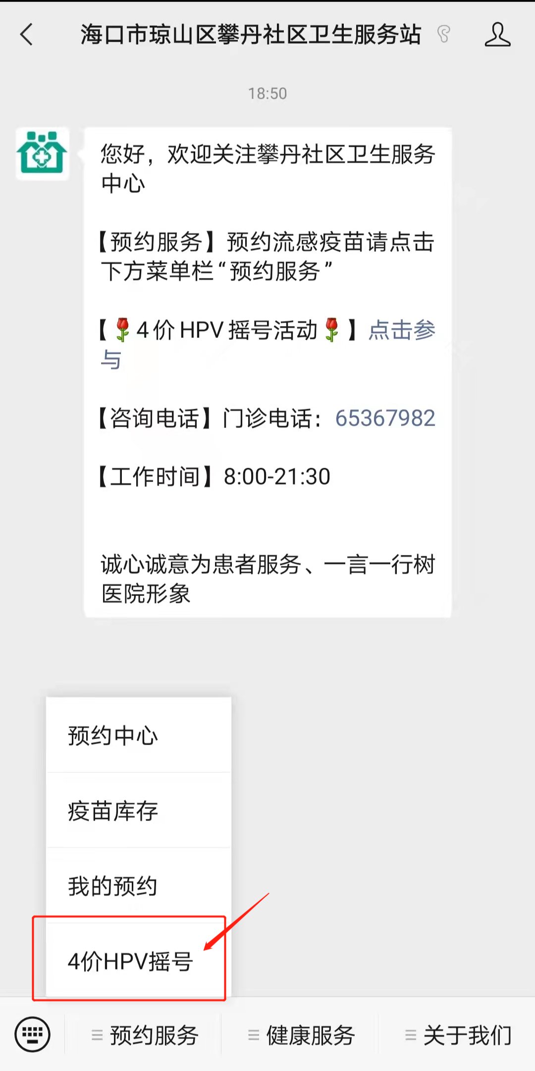 1.关注“海口市琼山区攀丹社区卫生服务站”微信公众号;